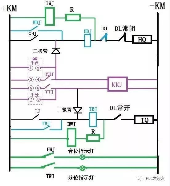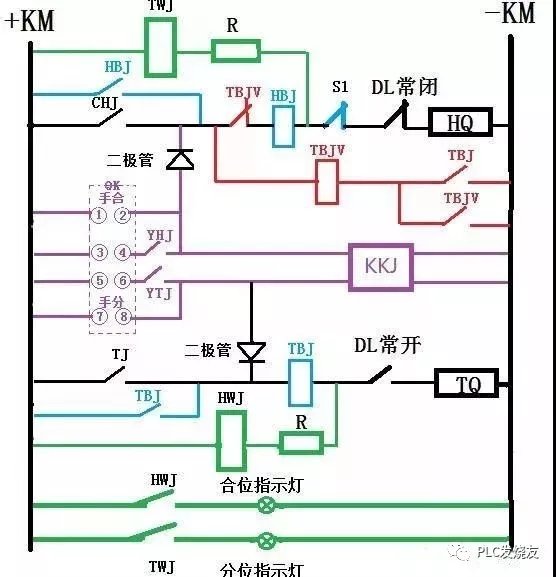 04 合后继电器(KKJ) 断路器分、合闸操作一般有就地手动、远方遥控以及保护装置自动控制三种方式,控制回路应该具有区分保护装置动作和人为操作断路器的功能,所以还应加入合后继电器(KKJ),详见图中紫色部分。