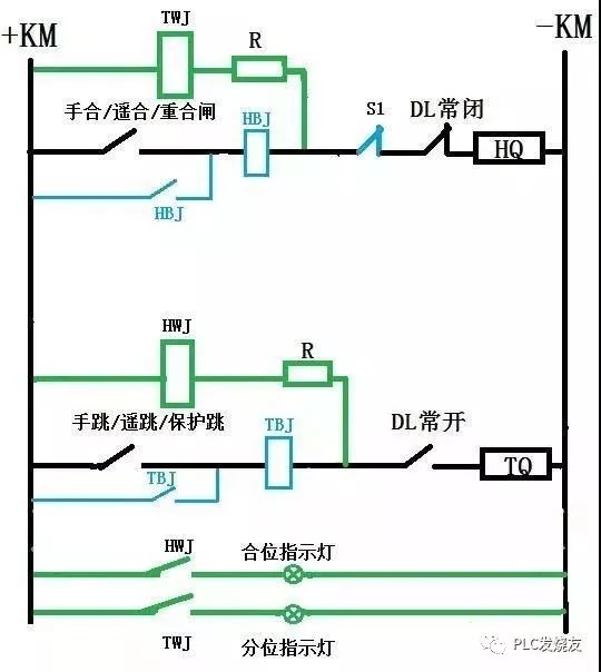 监视回路 以上的回路是不能满足实际需要的,前面提到的控制回路的基本要求,控制回路应该能够反映断路器的位置状态以及跳合闸回路的完整性。所以我们在回路中增加了TWJ、HWJ来监视跳闸回路、合闸回路的完整性。图中用绿色表示。HWJ和TWJ分别为合、分闸监视继电器。