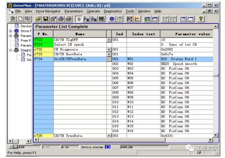即DB15.DBW12~DB15.DBW22对应P734的W01~W06。B15.DBW0~DB15.DBW11对应k3001~k3012。PLC读取变频器的数据可以通过设置参数P734的值来实现,PLC写给变频器的数据存放在变频器数据k3001~k3012中,在变频器的参数设置里可以进行调用,从而建立了彼此的对应关系。
