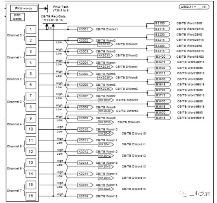 对于写变频器的数据是与变频器的k3001~k3016(参见变频器使用大全功能图120)建立对应关系,读变频器的数据则是与变频器的参数P734建立对应关系。如下图所示:
