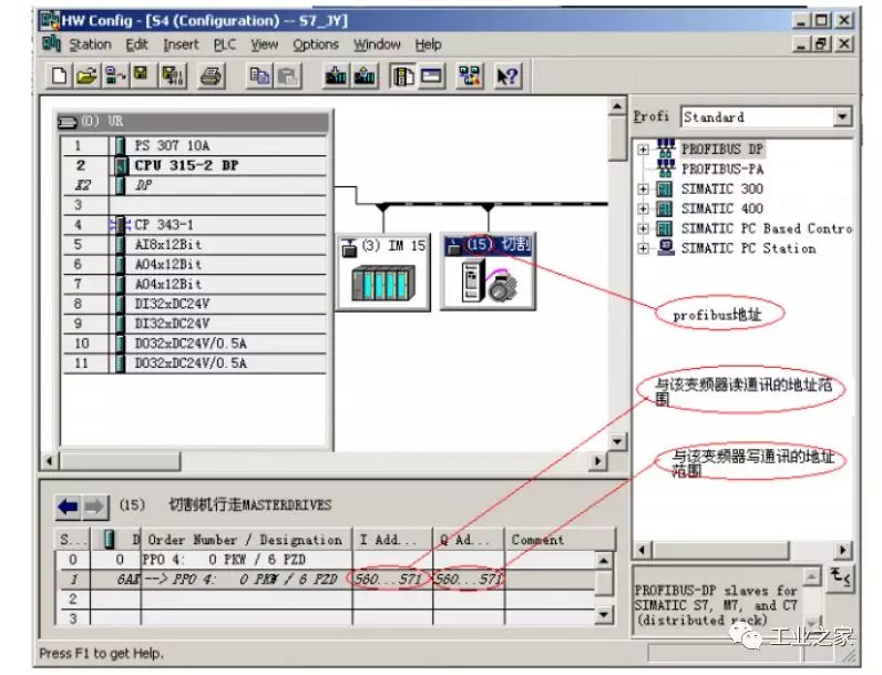 在STEP7软件中创建一个项目,再硬件组态该项目,并建一个PROFIBUS-DP网络,变频器在PROIBUSDP->SIMOVERT文件夹里进行组态,并设定好通讯的地址范围。如下图所示: