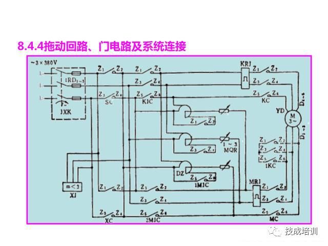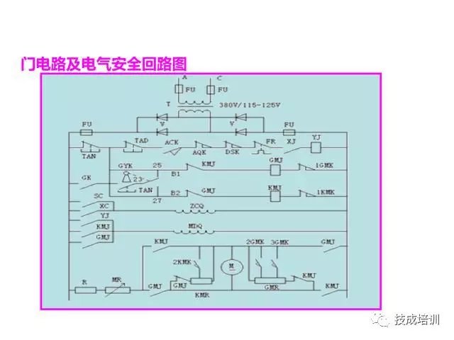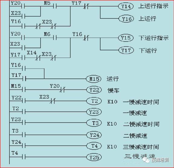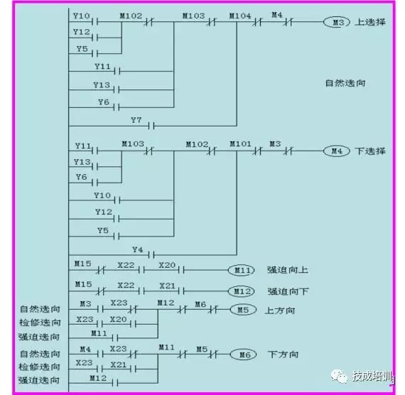 (3)选向回路 选向回路的作用,是根据目前电梯的位置和指令、召唤的情况,决定电梯的运行方向,是向上或是向下。 电梯方向的选择,实际就是将指令和召唤的位置与电梯实际位置相比较,若前者在上(位置的上下)电梯则选择向上,相反则选择向下。 方向的实现:首先由层楼继电器形成选向链,然后将每层的指令和召唤对应接入。 实际决定电梯的运行方向有以下三种情况。 a.自然选向 如上分析,电梯自己判断来选择方向。 b.强迫选向 若电梯工作在司机方式,可通过操纵箱上的向上或向下按钮,来干预电梯的运行方向,即强迫使其向上或向下。 c.检修选向 若电梯工作在检修方式,同样可使用向上或向下按钮,使电梯以检修的速度向上或向下运行。电梯的选向回路梯形图如图所示。