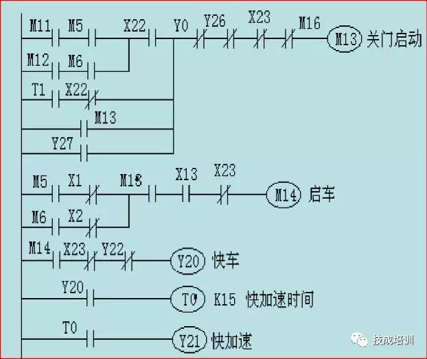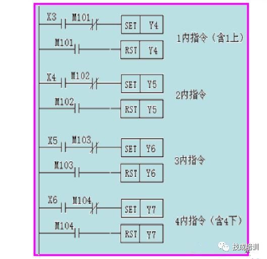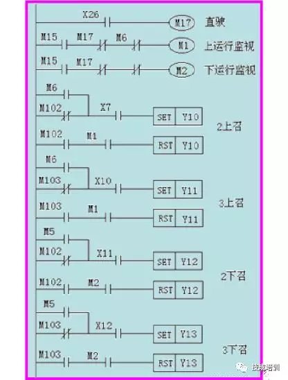 2. 指令和召唤回路 指令和召唤回路的作用是:将轿内指令和厅外召唤信号记忆并指示,当电梯响应后自动将 其消除。 记忆和消除可用PLC的SET和RST指令实现。 (1)指令回路 指令回路梯形图如图所示 (2)召唤回路 由于除两个端站外,其它各层均有两个召唤(上召、下召),而且召唤的响应是顺向响应。 另外若电梯在直驶运行时不响应召唤,此时召唤应保留。所以召唤回路与电梯的运行方向以及是否直驶密切相关,为此在召唤回路中加入了反映直驶和方向监视的继电器M1和M2。