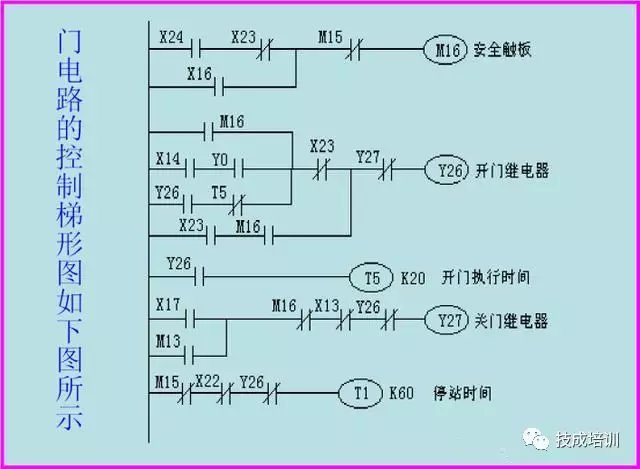 5. 电梯门的控制 门电路是电梯控制系统中较为独立的单元。它的作用是实现电梯门的开和关。 门电路和控制系统的联系就在于这一点,由各厅门和轿门的门锁电气限位开关的常开触电串联后,作为门锁信号(X13)。X13为ON,表示全部门安全关闭,可正常运行,否则不能运行。开、关门由门电动机驱动,通过开、关门继电器KMJ、GMJ控制M的正反转实现。因此,设计门的控制时只需考虑开与关门的情况,对应驱动KMJ或GMJ (1)开门情况 上班开门、按钮开门、触板开门和门区提前开门。 (2)关门情况 下班关门、按钮开门、停站自动延时关门和强迫向上(向下)启动关门。