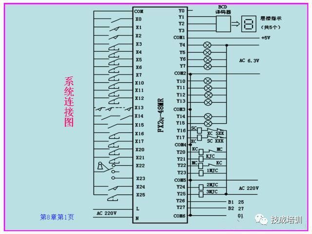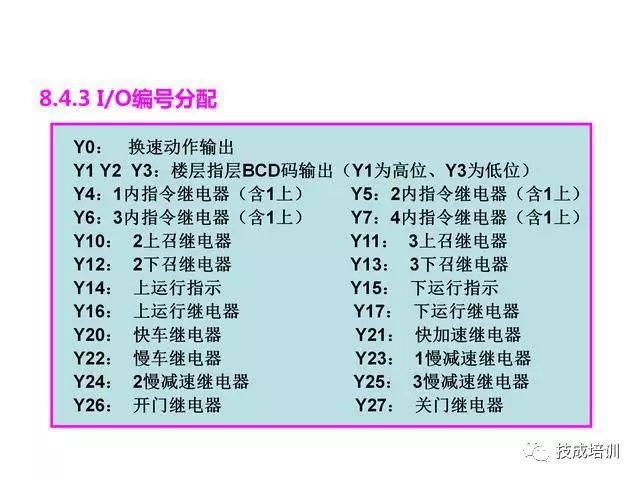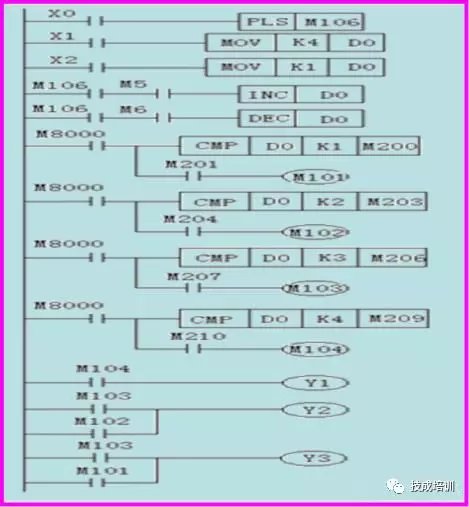 2 . 控制要求 电梯的控制方式有:轿内手柄开关控制、轿内按钮开关控制、轿外按钮开关控制、信号控制、集选控制和群控等几种。 集选控制方式是将厅外召唤箱发出的外召信号与轿内操纵箱发出的内指令信号进行记忆,并和其它专用信号(如层搂、减速、平层、安全等信号)加以综合分析后,由电梯司机或乘用人员控制电梯运行的控制方式。 主要控制要求有如下。 (1)有司机或无司机控制; (2)自动开关门; (3)到达预定停靠层站,提前减速,平层停车时自动门; (4)到达上、下端站,提前强迫减速; (5)厅外有召唤装置,轿内有指令装置,能自动记忆召唤和指令,响应之后,能自动将召唤和指令消除(召唤和指令的记忆与消除); (6)能自动选择运行方向,在司机操纵下,能强迫决定运行方向(选向); (7)能根据指令和召唤的位置,自动选择停靠层站,并自动平层停车(选层、平层); (8)厅外和轿内有指示电梯运行方向和所在位置的指示信号(层搂检测与指层)。 3.控制系统各环节的作用及实现 要对电梯进行控制,首要的问题就是反映电梯实际所在的位置(楼层)。 层楼继电器回路就是完成这一功能的。每一层对应一个层楼继电器,电梯在哪一层,对应楼层的层楼继电器就会动作。 PLC具有数据传送、算术计算、数据比较处理等功能,所以用PLC很容易能实现层楼电路: 启用一数据寄存器D0,电梯在最下层端站时可将1送入D0,最上层端站时,将最高层数送入D0;电梯每上升一层将D0自动加1; 电梯每下降一层D0自动减1,这样使D0中存放的始终是层数; 然后,将D0分别与1、2、3、……相比较,等于几就说明电梯在几,这时驱动对应的层楼继电器,实现层楼电路。 四层四站的层楼继电器电路梯形图如图所示。