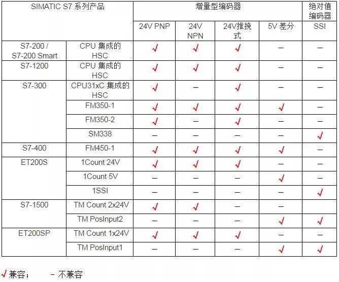 高速计数模块与编码器的兼容性 高速计数模块主要用于评估接入模块的各种脉冲信号,用于对编码器输出的脉冲信号进行计数和测量等。西门子SIMATIC S7的全系列产品都有支持高速计数功能的模块,可以适应于各种不同场合的应用。 根据产品功能的不同,每种产品高速计数功能所支持的输入信号类型也各不相同,在系统设计或产品选型时要特别注意。下表给出了西门子高速计数产品与编码器的兼容性信息,供选型时参考。