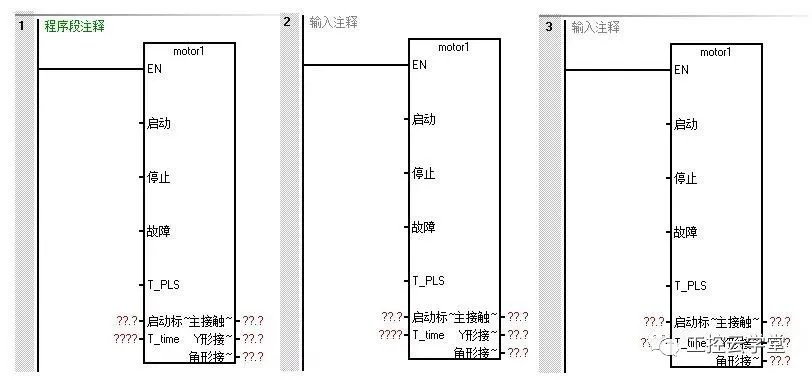 西门子在这方面有一个很好的解决方案。那就是通过局部变量,设计出程序框架,做成库。后面就可以反复调用。一个电机调用一次,只需要填写按钮的输入点,接触器的输出点就可以,这样编程效率大大提高;出错概率大大降低,程序一致性很好。