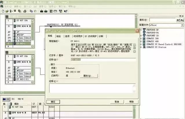 图1 STEP7硬件组态2. 双击CP443-1槽的CP443-1,弹出属性对话框,如图2所示: