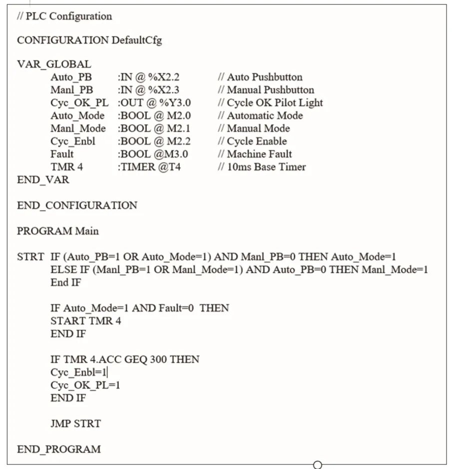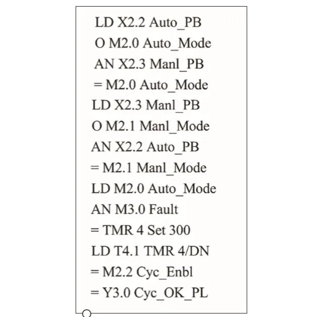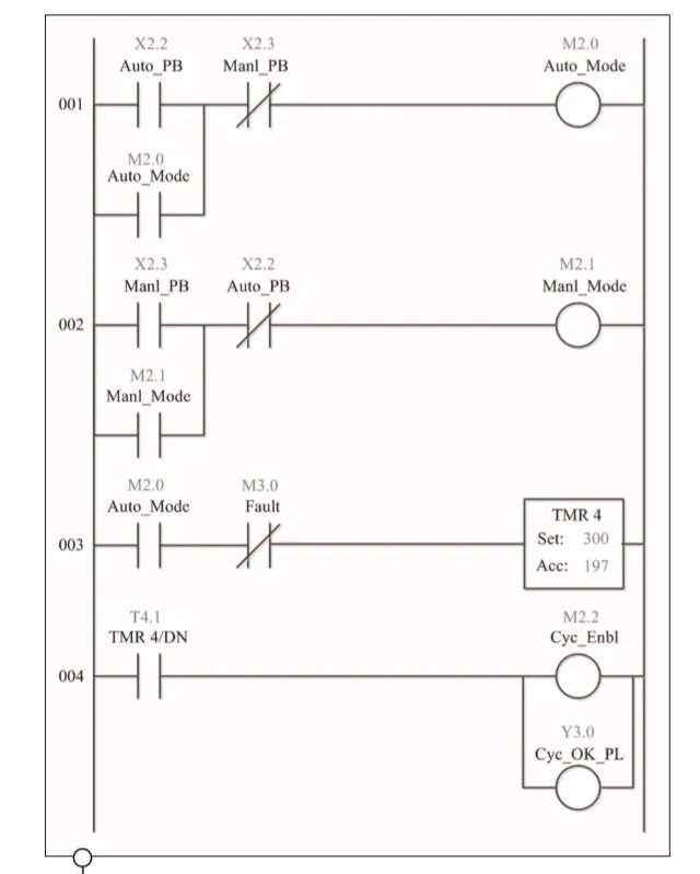 几年前,我突发奇想 :如果用所有5种语言,来编写一小段代码进行比较,将会非常有趣。逻辑建立自动和手动模式,然后在3秒钟后激活“循环”位。它是通用的,但是基于我使用的PLC平台(图1至图5)。语法和代码显示方式会因软件品牌和平台而异。