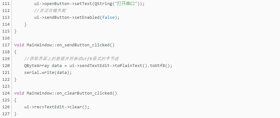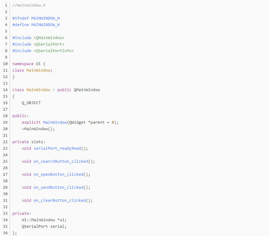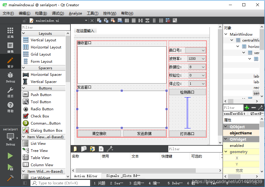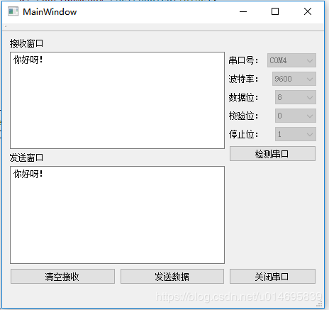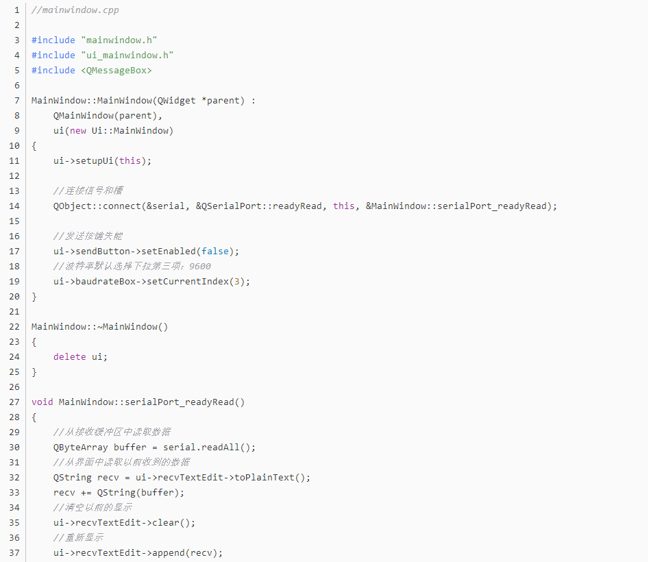 串口不用时,可通过close()函数将其关闭。 接下来是一个实例 1、创建一个新的Widgets Appliaction工程 2、使用QtCreator的ui文件来设计上位机的界面,设计如下: 3、mainwindow.h文件内容如下: 4、mainwindow.cpp文件内容如下: 5、main.cpp文件内容如下: 6、测试(将USB转TTL模块发送和接收引脚短接,自己发自己收)