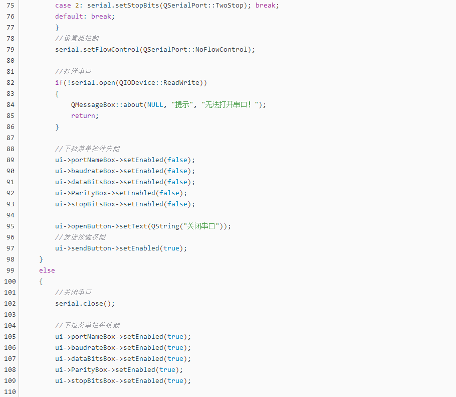 串口在收到数据后,会将数据存入接收缓冲区。此时,我们可以通过readAll()函数将接收缓冲区的数据读出来。当串口的接收缓冲区有数据时,QSerilaPort对象会发出一个readyRead()的信号。因此,我们可以编写一个槽函数来读数据,例如: