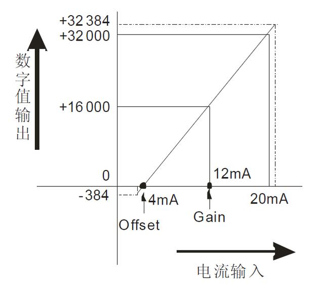 以上为台达PLC电流输入信号与读取信号的对应关系 通过以上对应关系图,可以知道对于一个任意的电流输入信号(X),与读取到的数值信号(Y),有如下的对应关系: