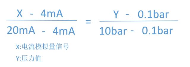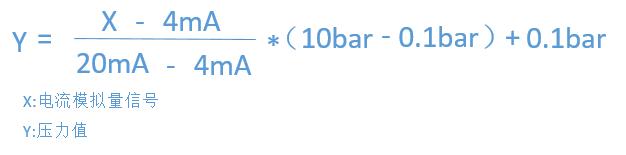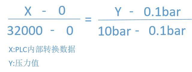 由以上公式,可以将PLC读取到的整数数据,转换为PLC接收到的模拟量电流信号值。 2、实际物理值与模拟量数据之间的转换 实际物理值与模拟量数据之间的转换方式同上面的转换方式相同。如下为某压力变送器的压力与模拟量信号范围(0.1-10bar,4-20mA),同样的,压力与电流之间有如下的转换关系公式: