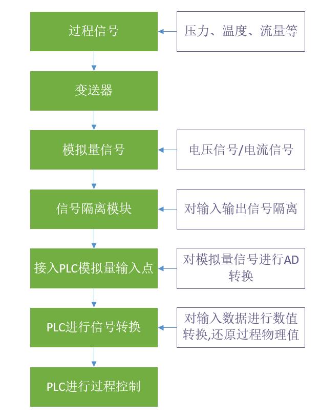模拟量信号是自动化过程控制系统中最基本的过程信号(压力、温度、流量等)输入形式。系统中的过程信号通过变送器,将这些检测信号转换为统一的电压、电流信号,并将这些信号实时的传送至控制器(PLC)。 PLC通过计算转换,将这些模拟量信号转换为内部的数值信号。从而实现系统的监控及控制。从现场的物理信号到PLC内部处理的数值信号,有以下几个步骤: