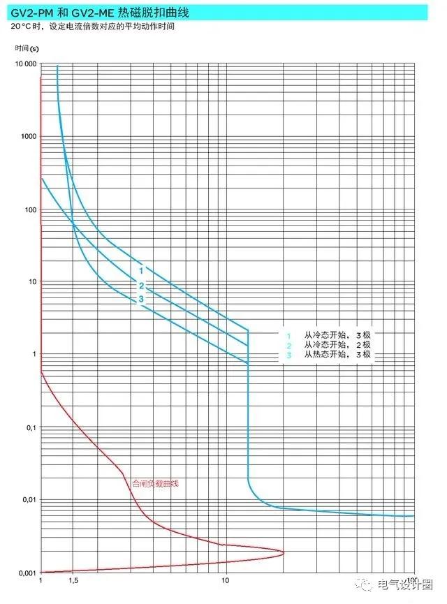 从上图中可以看出施耐德IC65系列的脱扣特性有以下几点: (1)断路器最快脱扣时间是0.01S。 (2)10倍额定电流时,断路器将直接跳闸(C曲线)。 (3)负载电流超出额定电流的倍数越多,断路器的跳闸等待时间就越短。 三、施耐德GV2系列热磁脱扣曲线分析