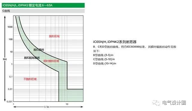 (C型脱扣曲线) 上图是施耐德IC65系列63A以下的C型脱扣曲线。 横坐标是负载电流I与额定电流In的比值即额定电流的倍数。它从1倍开始,每一格加一倍往上递增。 纵坐标是时间t,单位秒。时间从0.001S开始每递增10倍时间为一个大格,一个大格分10个小格。 从图中可以看出,两条曲线将整个区域分成脱扣区域、延时脱扣区域和不脱扣区域三个部分。 处在上方的曲线是脱扣曲线,表示时间t在进入这条曲线的上方(脱扣区域)时,断路器必然脱扣跳闸。 由脱扣起始曲线与脱扣曲线围成的区域为延时脱扣区域,在该区域的时间段内,断路器处于即将要跳闸的状态,即脱扣器的热元件进入升温状态,热平衡被打破,随着时间t的增加,热元件发热量超过脱扣器的脱扣点(进入脱扣区域),断路器就脱扣了。
