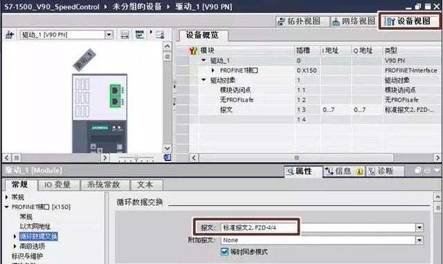 4. 在V90PN的设备视图中配置通信报文为标准报文2