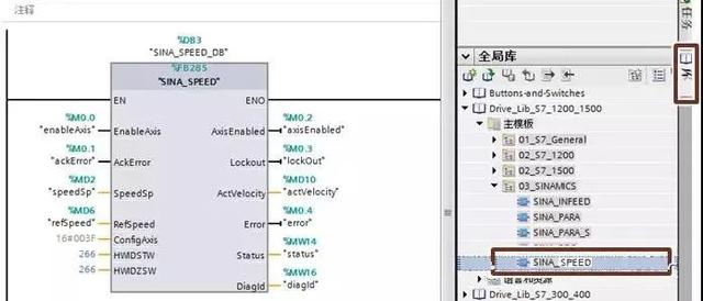 3. 编写程序 在OB1中将DriveLib_S7_1200_1500中的SINA_Speed(FB285)功能块拖拽到编程网络中(此功能块只能与标准报文1配合使用),进行速度控制: