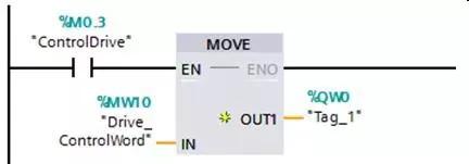 在OB1中调用MOVE命令,发送对驱动的控制字及速度给定: 1. 通过第一个控制字进行驱动器的起停控制(16#047E->16#047F)