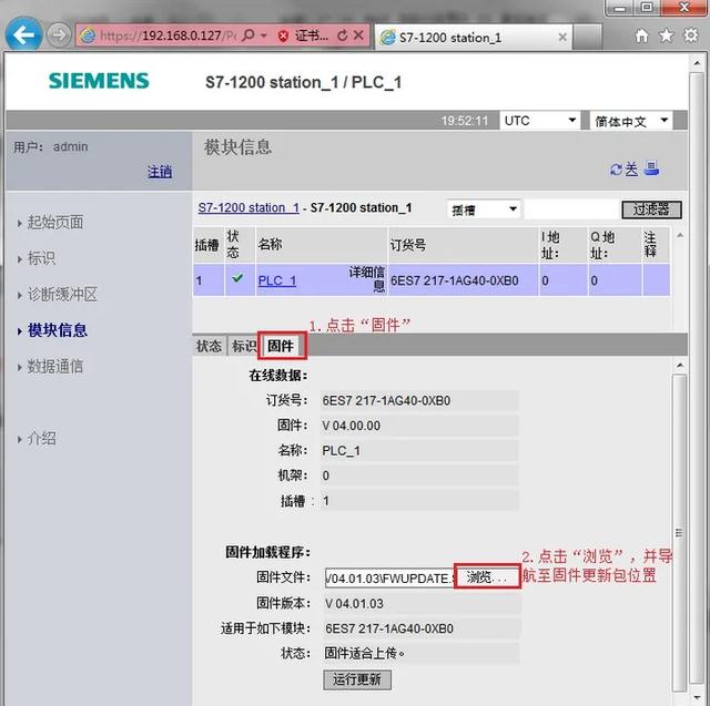 5.在PLC站点信息显示页面,点击“固件”按钮,并"浏览"至固件更新包,点击“运行更新”按钮,即可执行CPU固件更新操作。