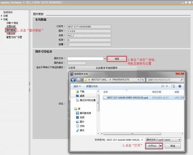 S7-1200 CPU的固件可以通过以下3种方式进行升级: 使用存储卡更新CPU固件。 通过Web访问方式更新CPU固件。 1 使用存储卡更新CPU固件 注意事项: 不同订货号的S7-1200CPU的固件文件不相同。用户在下载和更新固件之前请核对产品订货号。