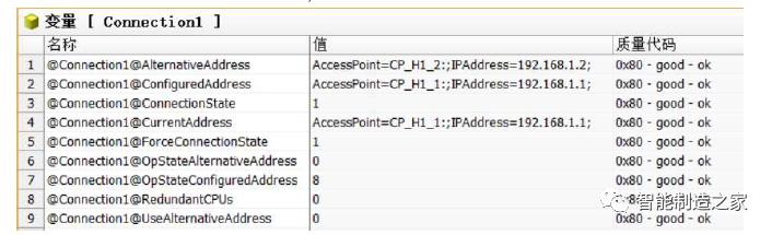 • “@<connectionname>@OpStateConfiguredAddress ” :读取S7-1500R的CPU1 当前的操作模式,0: not connected,4: STOP,6: STARTUP,8: RUN,22: SYNCUP。