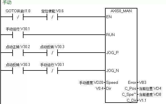其次我们接着编写手动部分的程序,手动运行正反转时需要互锁,并且在自动模式时手动模式不能运行,所以用定位使能及自动运行两个条做手动程序的EN位