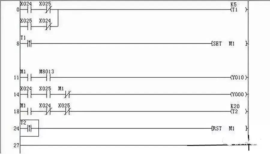 在梯形图和指令语句表中,很容易找到该输出继电器的线圈电路及其得电、失电条件,但引起该线圈的得电、失电及其相关电路就不容易找到,可采用逆读溯源法去寻找:
