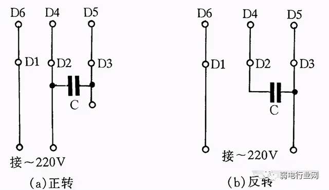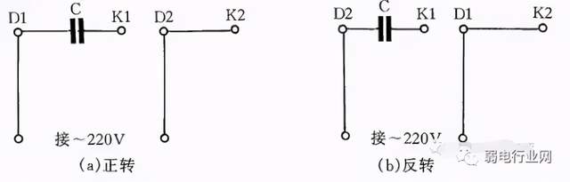 图4是JX07A-4型单相电容运转电动机接线方法。电动机功率为60W,用220V/50Hz交流电源、电流为0.5A。它的转速为每分钟1400转。电容选用耐压400~500V、容量8μF的产品。图4(a)为正转接线,图4(b)为反转接线。