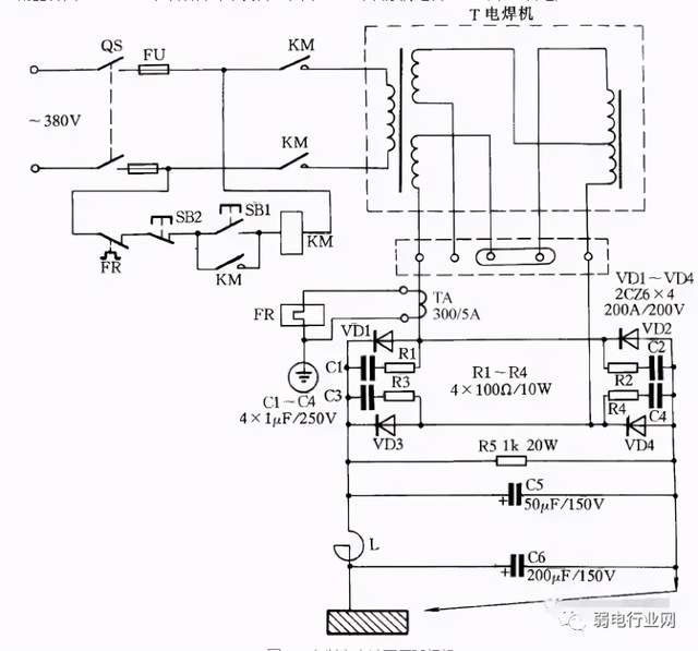 电路中VD1 ~ VD4 为4 只硅整流二极管;R1 ~ R4、C1 ~ C4组成硅整流器件的过压保护电路;FR 为过流继电器,保护硅整流器件。当负载电流超过额定值时,电流互感器次级电流相应增加,带动继电器FR 动作,FR 常闭触点打开,接触器KM 释放,触点打开切断电焊机电源。硅整流器件用0. 25kW 风扇作风冷设备。图中,C5 为滤波电容,R5 为泄放电阻。