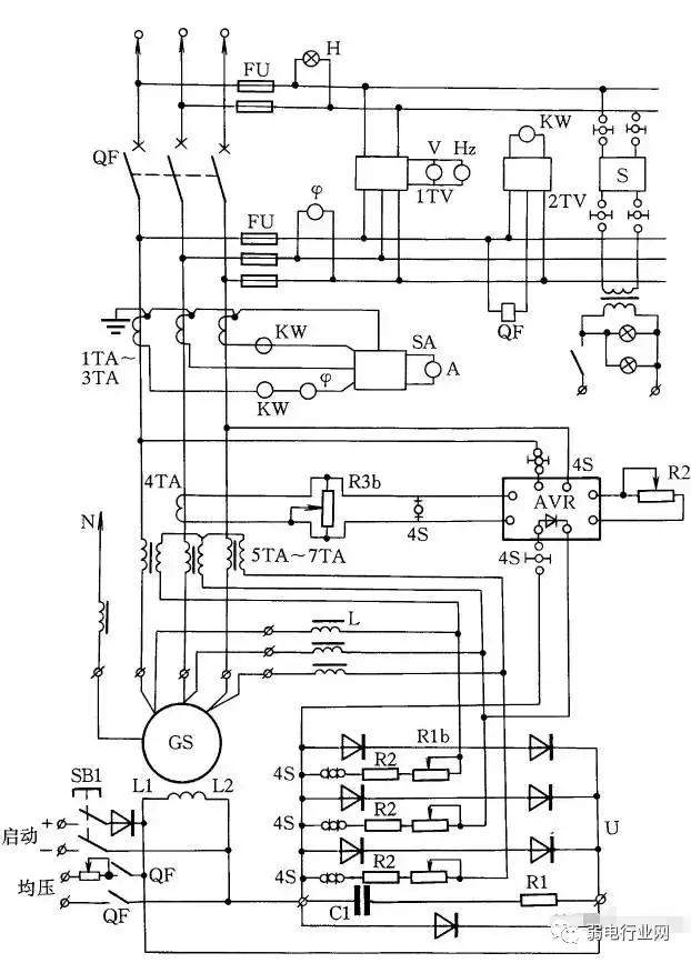HF-4-81系列发电机控制线路如图15所示,它与T2XV系列小型三相同步发电机配套。同步发电机的励磁系统采用电复合相复励调压。发电机端电压经线性电抗器L移相,然后与发电机负荷电路中的电流互感器5TA~7TA二次电压合成,经三相桥式整流器整流后,供发电机GS励磁自动调压。