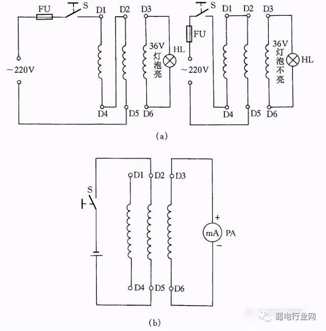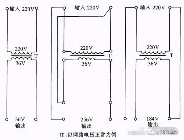 采用此法应注意两点:一是在接线前必须把行灯变压器次级一端与壳体的连接线(保护接地线)拆除;二是要注意行灯变压器的初、次级绕组的电流都不能超过各自的额定电流值。