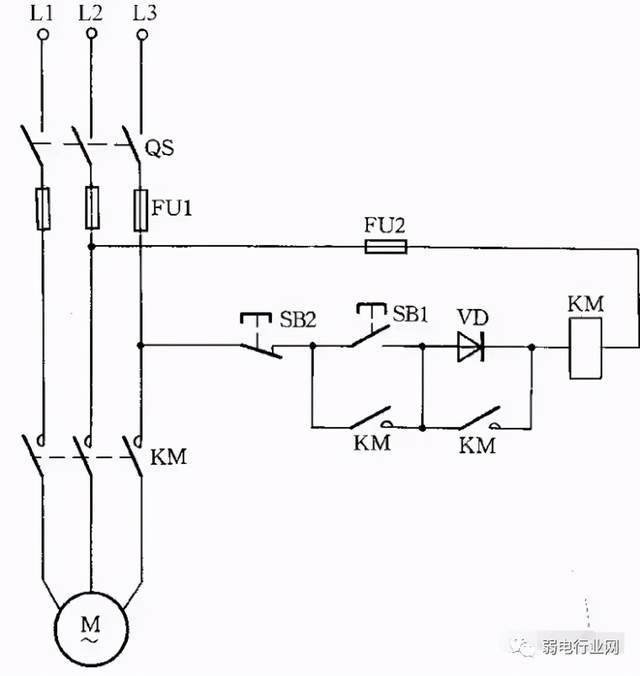 因为启动电流较大,所以这种线路只适用于操作不频繁的场合。线路中,VD应选用耐压大于700V的二极管,电流要根据交流接触器线圈电流而定。