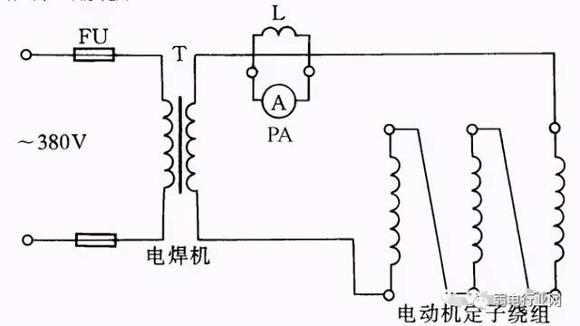 如果电动机受潮,而体积又较大,很不容易拆下放在烘箱内干燥。可将电焊机低压电通入电动机三相绕组,用电流升温干燥电动机。此方法适用于干燥20~60kW的电动机,电焊机的容量应根据电动机容量而选用。通入电动机绕组线圈的电流可由电焊机来调节,但在烘干时应注意通入电动机的电流不能超过电动机本身额定电流太多,并且注意观察电动机和电焊机温度都不能升得过高。线路参见图31。