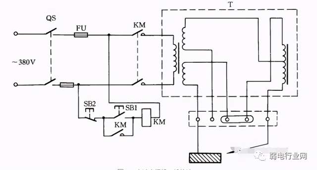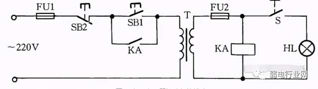 工作原理:闭合S后,按下按钮SB1,变压器得电输出36V低电压,使得继电器或交流接触器KA吸合。放松按钮SB1后,KA自锁触点使KA保持吸合,继续给变压器接通电源。如果变压器次级发生短路故障,继电器线圈电压为零,此时KA便失电释放,将变压器电源断开,保护变压器不被破坏。