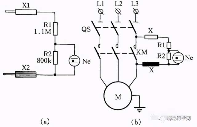 图18所示是自制的绝缘检测器线路,它既可用作线路绝缘监视,又可代替兆欧表检查电机、测电器的绝缘电阻。当合上隔离开关QS,在相电压作用下,整个绕组和接地外壳之间的泄漏电流流过绝缘层和电阻R1、R2。如果绝缘电阻合乎标准(即绝缘电阻值大于0.5MΩ),则泄漏电流很小时,在R2上的电压降小于氖泡的点燃电压,Ne不亮;当任意两相或三相同时对机壳的绝缘电阻降低时,泄漏电流大增,使氖泡Ne点燃,从而可判定绝缘不合格。
