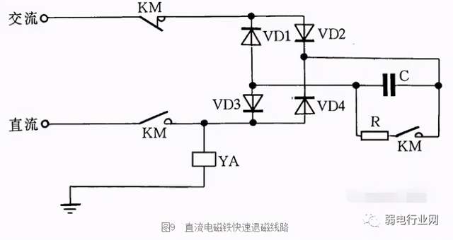 直流电磁铁停电后,因有剩磁存在,有时会造成不良后果。因此,必须设法消除剩磁。图9中,YA是直流电磁铁线圈,KM是控制YA启停的接触器。KM吸合时,YA通电励磁;KM复位时,YA断直流电,并进行快速退磁。