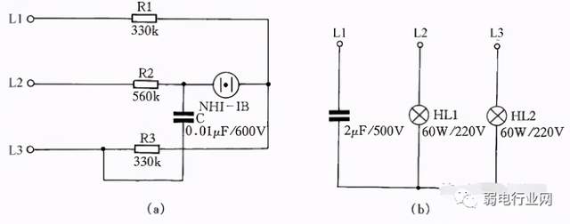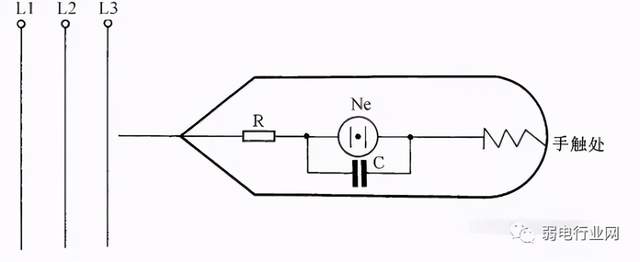 在测验三相交流电时,如果带电的线路较长,即使三相交流电缺一相电源,用一般的验电笔测试也很难判断出是哪根电线缺相(因为线路较长,并行的线与线之间产生的电容容量增大,使不带电的某一根电线产生感应电)。为了快速、准确地判断,可在一般的低压验电笔的氖泡上并联一只1500pF小电容,这样在测强电时,电笔照常发光。而测得的是感应电时,感应电会通过电容再经过人体被大地吸收掉,所以电笔不发光。在自制这种验电笔时应把电笔上串联的保护电阻放在测电笔线路的最前端以保障安全,见图36。