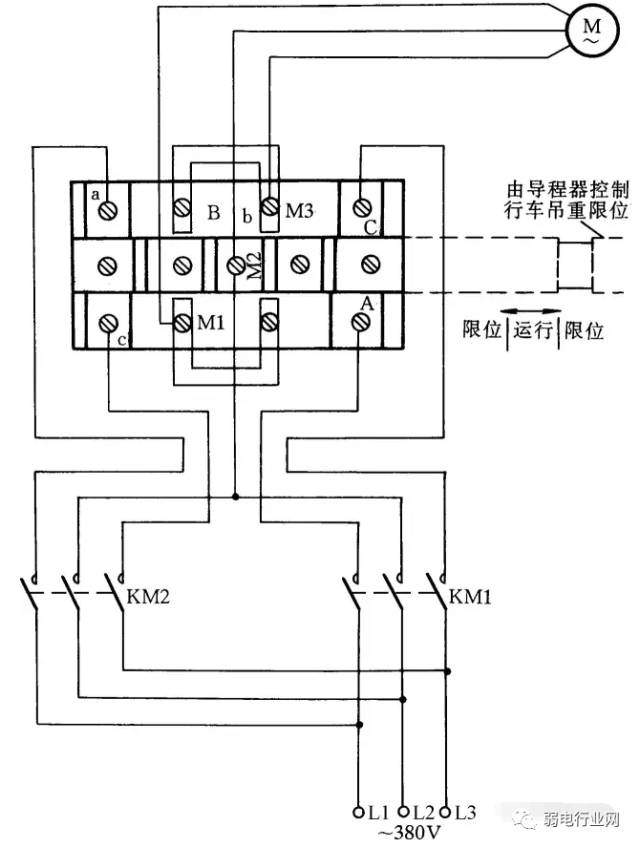 车间安装的行车、吊葫芦的起重电动机上,往往需安装保护限位装置,在电动机通电后,避免人为操作失误或接触器触点粘连或铁芯极面脏而不释放造成超上限或超下限工作。因此,限位器在工厂和企业应用极为广泛。这里介绍一种常用限位器接线方法,这种限位器主要用于行车的上下电动机限位。当吊钩高于限制位置时,它会使电动机自动断开电源。这种方法一般是断开主电机电源线,而不是用控制线控制接触器通断电动机停止限位,其优点是万一接触器触点熔在一起不能断开时,限位器同样能起到保护限位的作用。其接线方法如图38所示。