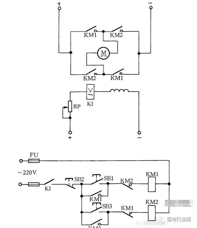 在励磁电路内,串联一个欠电流继电器KI,其常开触点接在控制电路中。当励磁电流消失或减小到设定值时,KI释放,KI常开触点断开,切断电动机电枢电源,使电动机停转,从而避免超速现象发生,见图11。