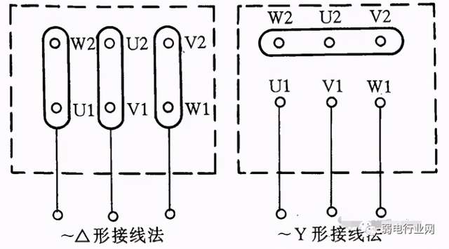 目前,Y系列电动机被广泛应用。Y系列电动机具有体积小、外形美观、节电等优点。它的接线方式有两种:一种为△形,它的接线端子W2与U1相连,U2与V1相连,V2与W1相连,然后接电源;另一种为Y形,接线端子W2、U2、V2相连接,其余3个接线端子U1、V1、W1接电源。接线见图6。