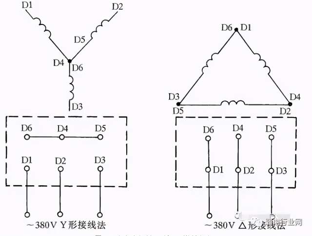 一般常用三相交流电动机接线架上都引出6个接线柱,当电动机铭牌上标为Y形接法时,D6、D4、D5相连接,D1~D3接电源;为△形接法时,D6与D1连接,D4与D2连接,D5与D3连接,然后D1~D3接电源。可参见图1所示连接方法连接。