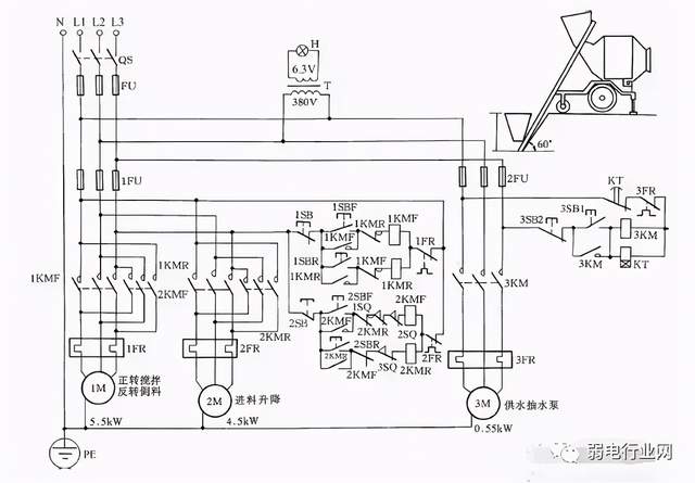 锥型JZ350型搅拌机线路如图17所示,工作原理是当把水泥、砂子、石子配好料后,操作人员按下按钮2SBF后,2KMF接触器线圈得电吸合,使上料卷扬电动机2M正转,料斗送料起升。当升到一定高度后,料斗挡铁碰撞行程开关1SQ和2SQ,使2KMF断电释放。这时料斗已升到预定位置,把料自动倒到搅拌机内,并自动停止上升。此时操作人员按下下降按钮2SBR时,卷扬系统带动料斗下降,待下降到其料口与地面平齐时,挡铁碰撞行程开关3SQ,使2KMR接触器断电释放,自动停止下降,为下次上料做好准备,这时搅拌机料已备好,操作人员再按下3SB1,3KM接触器得电吸合,使供水抽水泵电动机3M运转,向搅拌机内供水,与此同时,时间继电器KT得电工作,待供水与原料成比例后(供水时间由KT时间继电器调整确定,根据原料与水的配比确定),KT动作延时结束,从而使3KM自动释放,供水停止。加水完毕即可实施搅拌。按下1SBF正转按钮,1KMF得电吸合,1M正转搅拌,搅拌完毕后按下1SB停止按钮即可停止。出料时,按下1SBR按钮,1M反转即可把混凝土泥浆自动搅拌出来。然后按下1SB,接触器1KMR断电释放,1M停转,出料停止。
