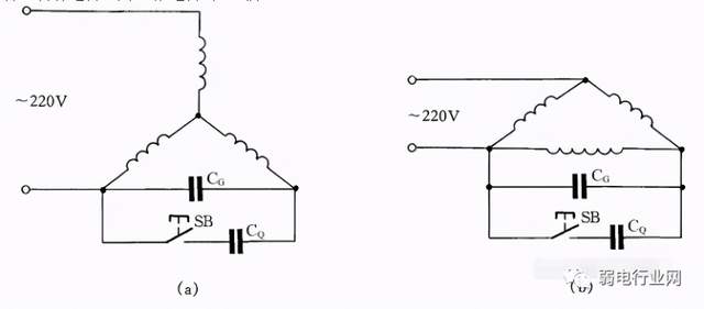如图19所示:图(a)为Y形接法电动机连接方法,图(b)为△形接法电动机连接方法。为了提高启动转矩,将启动电容CQ在启动时接入线路中,在启动完毕后退出。