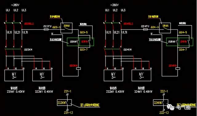 采用交流电磁铁制动的三相异步电动机有时会因制动电磁铁延时释放,造成制动失灵。造成电磁铁延时释放的原因是接触器的主回路电源虽被切断,但电动机由于剩磁存在,定子绕组产生感应电动势加在交流电磁铁上,使电磁铁不会立即释放。解决方法很简单,只要在交流电磁铁线圈上串入一个交流接触器常开触点,使得断开电动机电源的同时断开电磁铁与电动机绕组线圈,即可使电磁铁立即释放。线路参见图10。