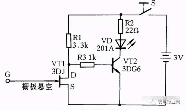 图28所示是一感应测电笔线路。它可方便地测出导线的断芯位置。在用来测导线断芯位置时,在导线一端接上220V的电源相线,然后用感应测电笔的探头栅极靠近被测导线,并沿线移动。如果发光二极管在移动中突然熄灭,那么此处便是导线断芯位置。