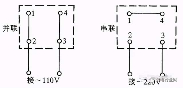 有的单相吹风机引出4个接线端子,接线方法如图5所示。采用并联接法应接入110V交流电源,采用串联接法应接入220V交流电源。