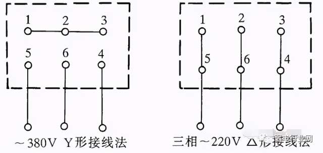 有部分三相吹风机有6个接线端子,接线方法如图2所示。采用△形接法应接入220V三相交流电源,采用Y形接法应接入380V三相交流电源。一般3英寸、3.5英寸、4英寸、4.5英寸的型号按此法接。其他吹风机应按其铭牌上所标的接法连接。