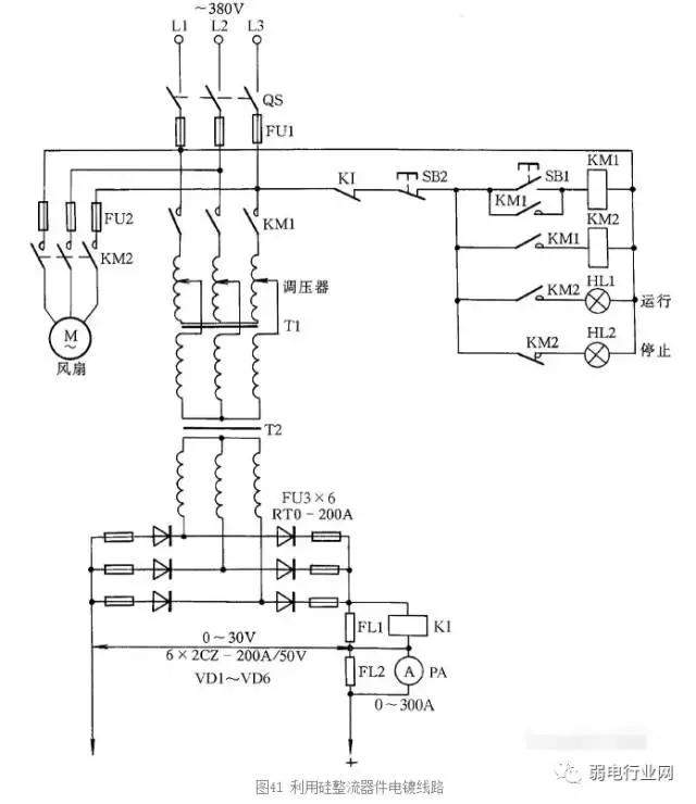 在电镀过程中,常常利用硅整流器件的调压电路进行工作,其工作原理如图41所示。当需进行工作时,按下按钮SB1,接触器KM1 线圈通电,主回路中触点闭合,线路输出直流电压。与此同时,KM2 也得电动作,接通电扇,对硅整流器件以及调压器吹冷风降温。线路中KI 为过流继电器。