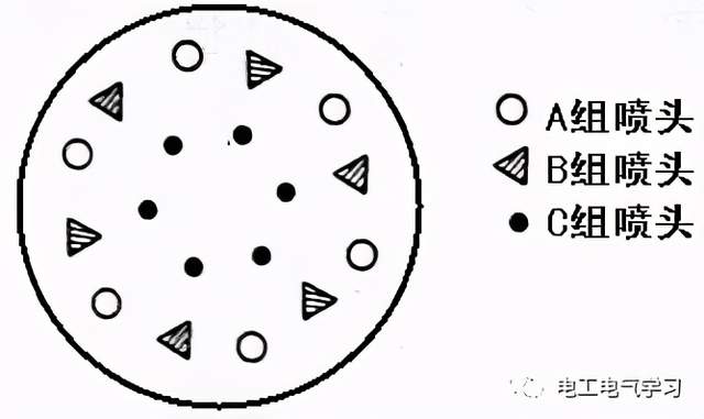 系统要求用两个按钮来控制A、B、C三组喷头工作(通过控制三组喷头的电动机来实现),三组喷头排列如图4-32所示。系统控制要求具体如下: